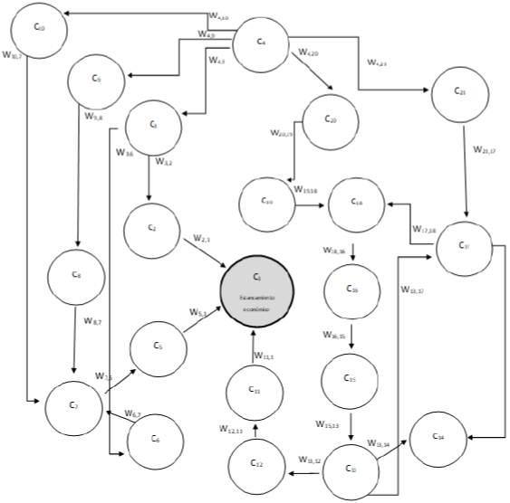 El MCD propuesto para la economía mexicana -se excluyen el comercio exterior, debido a las interdependencias internacionales que escapan del alcance de esta investigación, pero su relevancia queda aglutinada en la parte que no puede ser explicada- se presenta en la gráfica 3, el cual contiene 21 nodos (conceptos) y 26 conexiones que representan una relación causa-efecto, teniendo como nodo principal el estancamiento económico.