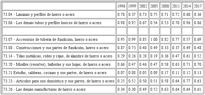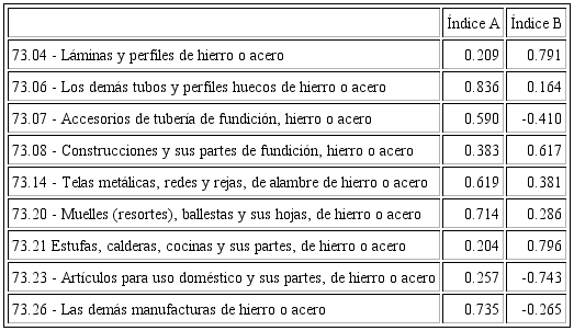 Las cuatro partidas restantes (73.04, 73.08, 73.21 y 73.23) reportan índices A bastante reducidos, por lo que en éstas el comercio marginal tendría un carácter eminentemente interindustrial. Las partidas 73.21 y 73.23 comprenden bienes destinados a usos domésticos, como estufas, parrillas, radiadores, hornos de cocina, y calentadores y calderas; así como utensilios como ollas, cazuelas, sartenes, regaderas, soportes, y planchas. Por otra parte, las partidas 73.04 y 73.08 incorporan numerosos bienes que, si bien se consideran de mediano contenido tecnológico, están diseñados para servir como insumos intermedios en diversidad de procesos industriales.