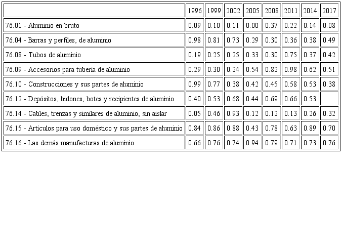 En el cuadro 4 aparecen los cálculos de los índices A y B de Brülhart para el capítulo 76, correspondiente al aluminio y sus manufacturas, durante el período 1996-2017.
