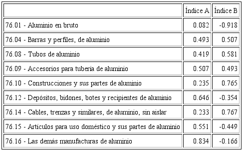 Como puede constatarse, cuatro de las nueve partidas del capítulo 76 reportan un índice A superior a 0.5: 76.09, 76.12, 76.15 y 76.16. Así las cosas, en estas cuatro partidas el CIIM es predominante. De estas cuatro partidas, sin embargo, tres reportan un índice B negativo, lo cual significa un desempeño exportador deficiente: 76.12, 76.15 y 76.16. De este modo, la única partida con comercio intraindustrial predominante que reporta un buen desempeño exportador (o un índice B positivo) es la partida: 76.09. Por otra parte, hay cinco partidas (76.01, 76.04, 76.08, 76.10 y 76.14) donde el índice A es inferior a 0.5, lo cual es sintomático de que el comercio marginal es fundamentalmente interindustrial. De estas cinco partidas, como indica el índice B, cuatro reportan un buen desempeño exportador (76.04, 76.08, 76.10 y 76.14), en tanto que sólo una registra un desempeño exportador negativo (76.01).