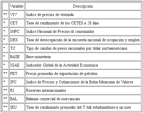 Los datos del Índice de Morosidad se obtuvieron del portafolio de información de la Comisión Nacional Bancaria y de Valores (CNBV) y la muestra corresponde a observaciones mensuales de diciembre de 2008 a junio de 2016, la información estadística del Índice de Morosidad de títulos respaldados con hipotecas sólo se publicó por la CNBV para este periodo, por lo que nuestro análisis se restringe a dicho periodo. Las variables económicas y financieras (cuadro 1), se eligieron de la revisión de la literatura en estudios nacionales e internacionales y corresponden al Índice de precios de vivienda, tasa de rendimiento de los Certificados de la Tesorería de la Federación (CETES) a 28 días, Índice Nacional de Precios al Consumidor (INPC), tasa de desocupación de la Encuesta Nacional de Ocupación y Empleo, tipo de cambio de pesos nacionales por dólar norteamericano, precio promedio de exportación de petróleo, Índice de Precios y Cotizaciones de la Bolsa Mexicana de Valores (IPC), reservas internacionales, tasa de rendimiento promedio del T-bill de Estados Unidos a un mes; y se proponen para este trabajo nuevas variables como posibles factores de riesgo sistemático y son la base monetaria, balanza comercial de mercancías y el Indicador Global de la Actividad Económica (IGAE).