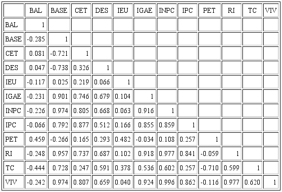 Las reservas internacionales muestran alta colinealidad con el INPC (0.97), base monetaria (0.95) e IGAE (0.91). No obstante, la balanza comercial presenta baja colinealidad con las variables de rendimiento del CETE (0.081), desocupación (0.047) e IPC (-0.066). También, puede observarse una baja correlación entre base monetaria y la tasa del T-Bill (0.025), desocupación y tasa del T-bill (0.066), INPC y el T-bill (0.063), IGAE y precios del petróleo (-0.034), reservas internacionales y precios del petróleo (-0.059). El determinante de la matriz de correlación muestra que las variables en conjunto muestran un alto grado de multicolinealidad.