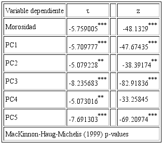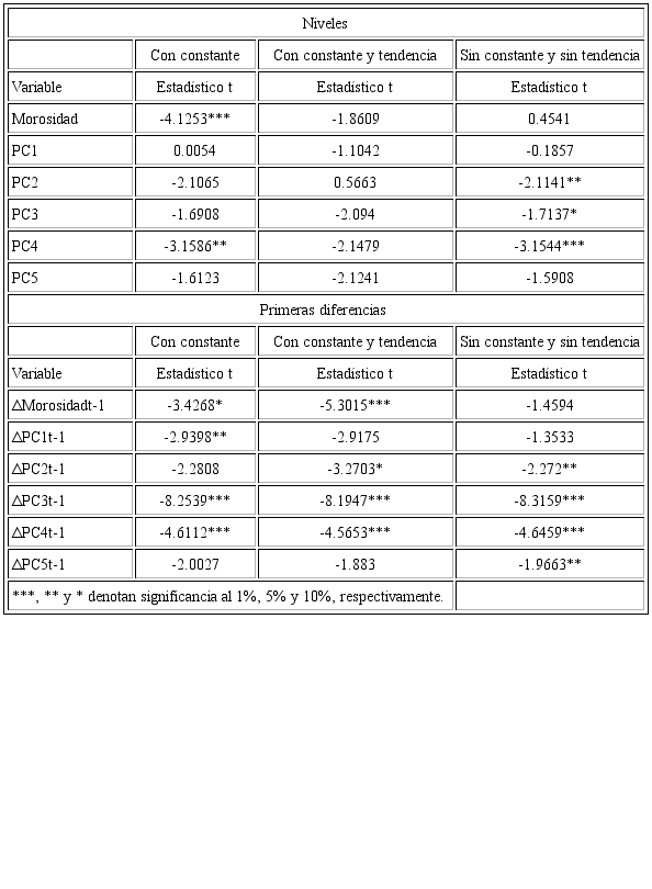 La prueba con constante y tendencia en primeras diferencias indica que la morosidad, tercer y cuarto componente son significativos al 1%, el segundo componente al 10%. El primer y quinto componente no rechazan la hipótesis nula. La prueba sin constante y sin tendencia en primeras diferencias revela que el tercer y cuarto componente alcanzan significancia de 1%, el segundo y quinto componente de 5%; la primera diferencia de la morosidad y del primer componente no rechazan la hipótesis nula.