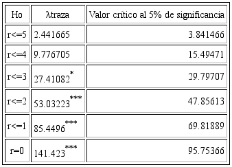 La τ (cuadro 5) sugiere una relación de largo plazo entre la morosidad y los primeros cinco componentes principales con significancia del 1% tomando como variables dependientes la morosidad, PC1, PC3 o PC5; como variable dependiente PC2 o PC4 se rechaza la hipótesis de no cointegración al 5%. El estadístico 𝑧 muestra resultados similares con excepción del cuarto componente, ya que no se puede rechazar la hipótesis nula de no cointegración al 10%. Los resultados sugieren adicionalmente la posibilidad de que la cointegración no sea unidireccional, la morosidad también puede ser relevante para el comportamiento de las otras variables, por tanto, se extiende el análisis a la prueba de Johansen.