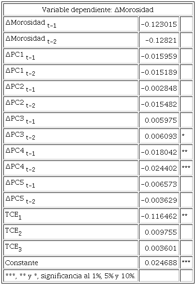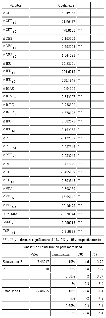 El modelo de corrección de error para la morosidad (cuadro 8), muestra que el coeficiente estimado para es poco significativo, mientras los coeficientes de , , y del término constante son altamente significativos. Las elasticidades de corto plazo del cuarto componente del riesgo del mercado de dinero internacional rezagado un mes y dos meses son significativos.