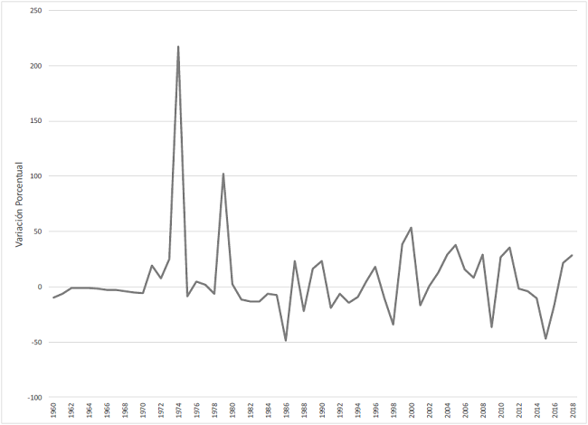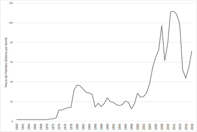 Es importante señalar que los precios del petróleo habían mantenido un comportamiento relativamente estable desde finales de la segunda guerra mundial y hasta principio de la década de los setenta, pero cuando estalló la guerra del Yom Kippur en octubre de 1973 la situación cambió, pues empezó el uso del petróleo como elemento de presión, haciendo que los precios del energético comenzaran a subir de manera desproporcionada (Weale, 2008). La gráfica 1 muestra el comportamiento de los precios internacionales del petróleo en el período 1960-2018.
