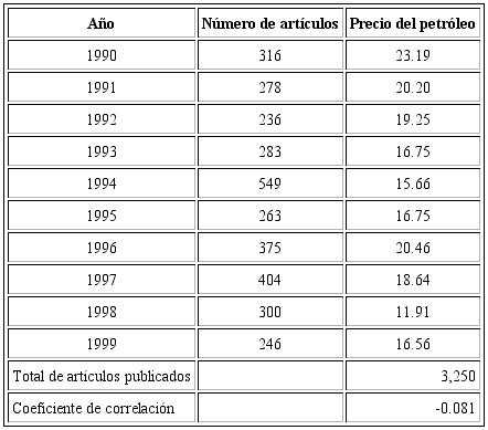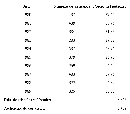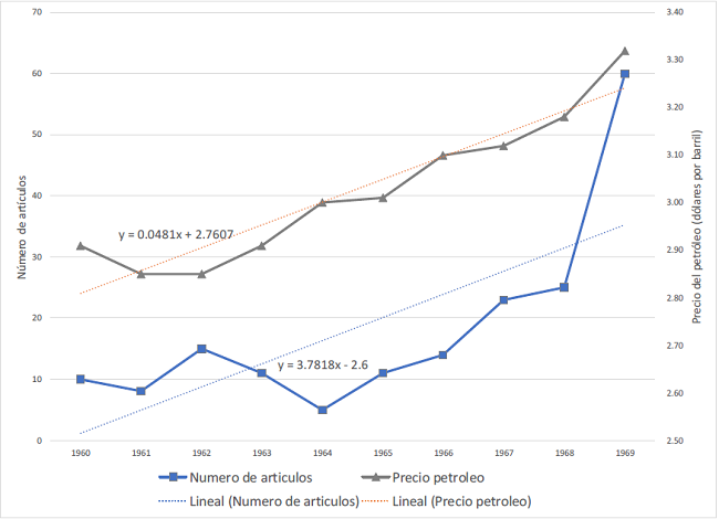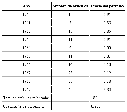La tabla 1 plasma una elevada correlación entre el número de artículos publicados y el precio internacional del petróleo (0.81). Este patrón es más de ver en la gráfica 3, donde se hace evidente un incremento leve, pero sostenido, del precio del petróleo. Cabe señalar que el precio nominal en el año de 1960 fue de 2.91 dólares por barril, mientras que para los dos siguientes años se nota un decremento de seis centavos de dólar, para retornar en los demás años a un crecimiento cercano a una tasa de 0.0481 anual, representando un promedio de crecimiento de siete centavos en los 10 años.