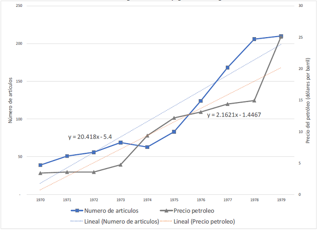 Los datos muestran una alta correlación (0.89) entre el número de artículos publicados y el precio internacional del petróleo para el periodo 1970-79. Es relevante mencionar que la tasa de crecimiento de las publicaciones reportadas en Scopus fue de 438.4%, al pasar de 39 artículos publicados en 1970 a 210 en 1979. Este patrón se puede apreciar mejor en la gráfica 4, donde se hace evidente un incremento más pronunciado del precio del petróleo.