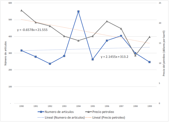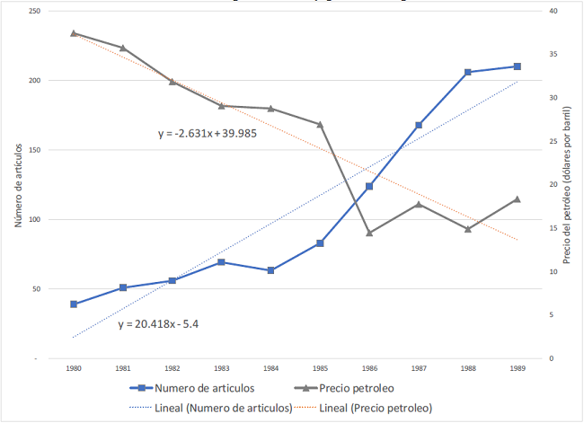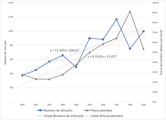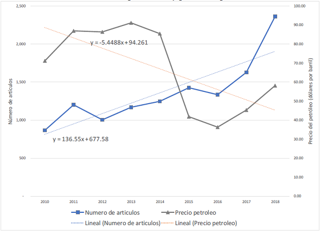 Las líneas de tendencia de la gráfica 8 confirman la desvinculación entre ambas variables, pues el número de artículos tiene una pendiente positiva de 136.5, lo que representa un aumento de 36.6%, mientras que el precio del petróleo exhibe una pendiente negativa de -5.44, lo que representa una caída general del precio para este periodo.