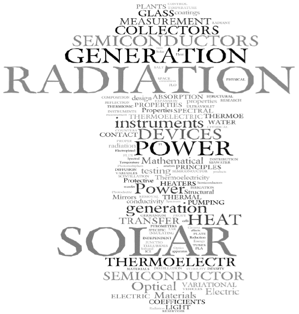De la figura 1 se colige que las publicaciones de esta etapa comenzaban a relacionar la radiación solar con la generación de energía eléctrica, lo que se comprueba mediante la prevalencia de palabras como SOLAR, RADIATION, GENERATION, POWER, INSTRUMENT, TRANSFER, DEVICES, SEMICONDUCTORS, TRANSFER, OPTICAL, MATERIALS, ELECTRIC, GENERATION, MATHEMATICAL, Etc. La figura anterior indica la importancia relativa de los resúmenes analizados.