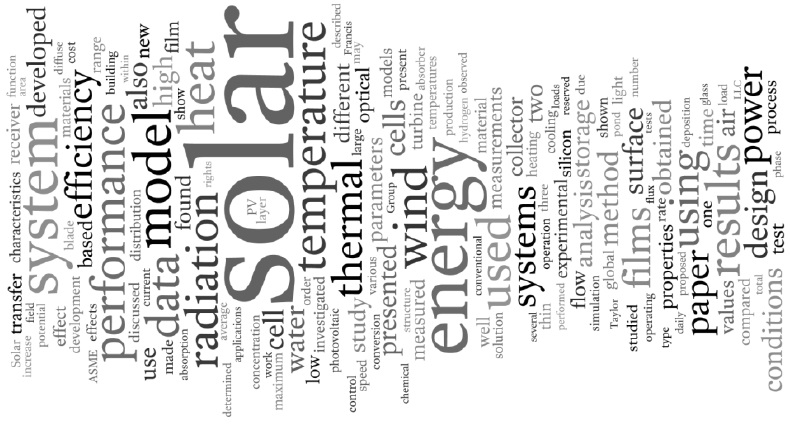 La frecuencia de palabras (en inglés) usadas en los resúmenes de los artículos registrados por Scopus entre 1980 y 1989 resalta la combinación de palabras como POWER, ENERGY, THERMICAL, SOLAR, HEAT, RADIATION, COLLECTOR y COMPOUNDS, indicando un auge en la investigación de nuevas tecnologías.
