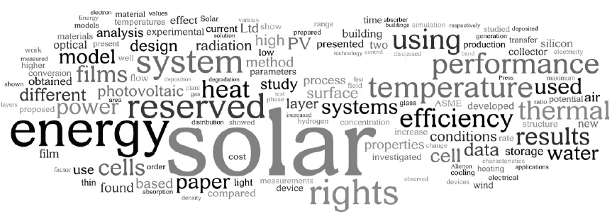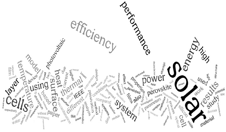 La figura 5 presenta las palabras más frecuentes en los resúmenes de los artículos recabados para el periodo, resaltando la eficiencia de las celdas fotovoltaicas como tema de investigación, tal y como lo sugieren palabras (en inglés) como SOLAR, ENERGY, SYSTEM, PHOTOVOLTAIC, POWER, EFFICIENCY, TEMPERATURE, PERFORMANCE, METHOD, RADIATION, MODEL, PRODUCTION, TIME, DEVELOPMENT, etcétera.
