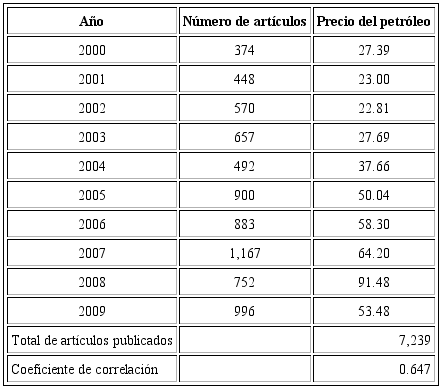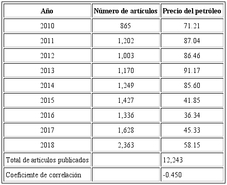 Con relación a la asociación precios-publicaciones encontramos que la tasa de crecimiento de los artículos ha superado las épocas previas con un ritmo cercano al 140%. Por su parte, el precio del petróleo se ha mantenido estable, aunque bajo un panorama poco alentador. La tabla 6 resume esta información.