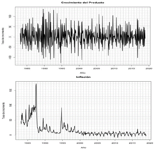En este trabajo empírico se considera una de las naciones en desarrollo más importantes de América Latina, para estudiar la relación de causalidad entre la inflación, la incertidumbre inflacionaria y el crecimiento económico. Se han utilizado series de tiempo mensuales del Índice de Precios al Consumidor (IPC) y del Índice de Producción Industrial (IPI) como variable proxy del nivel de precios y del producto. Los datos abarcan el periodo de agosto de 1984 a junio de 2019 y fueron recabados de las Estadísticas Financieras Internacionales (IFS, por sus siglas en inglés) del Fondo Monetario Internacional. La inflación se mide por la diferencia mensual anualizada del IPC,. El crecimiento del producto real se mide por la diferencia mensual anualizada del IPI, . Las series de tiempo de la inflación y la tasa de crecimiento del producto se muestran en la figura 1.
