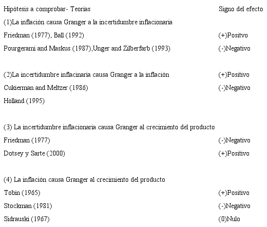 Los primeros estudios sobre la relación entre inflación y su incertidumbre inflacionaria y, que utilizaron la metodología GARCH como medida de la incertidumbre, mostraron, en su gran mayoría que existe evidencia a favor de la hipótesis de Friedman-Ball; es decir, que un incremento en la inflación lleva a una mayor incertidumbre inflacionaria (Grier y Perry, 1998; Fountas et al., 2004; Conrad y Karanasos, 2005; Fountas et al., 2006; Thornton, 2007; Grier y Grier, 2006; Fountas y Karanasos 2007; Bredin et al., 2009; Bredin y Fountas, 2009; Ozdemir, 2010; Jiranyakul y Opiela, 2011; Conrad y Karanasos, 2015).