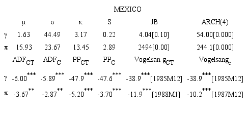 En el segundo panel se presentan las pruebas de raíz unitaria para la diferencia mensual anualizada. Se utilizaron dos diferentes pruebas estadísticas: La prueba Dickey Fuller Aumentada (ADF), con longitud de rezagos determinada por los criterios de información de Akaike (AIC) y de Schwarz-Bayes (BIC) y la prueba de Phillips-Perron, con longitud de rezagos determinado por Newey y West. Las dos establecen como su hipótesis nula la presencia de una raíz unitaria. En ambas series las pruebas ADF y PP indican estacionariedad. Adicionalmente, se utiliza la prueba desarrollada por Vogelsang y Perron (1998), para poder identificar la presencia de quiebres estructurales en las series de tiempo. Se puede identificar que para el caso de México se encuentra un punto de quiebre estructural en la tasa de crecimiento del producto en diciembre de 1985, mientras que para la inflación se ubica en diciembre de 1987.