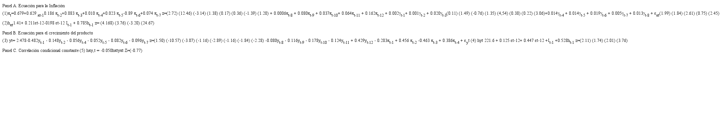 Donde 𝜋𝑡 es la tasa de inflación, 𝑦𝑡 es la tasa de crecimiento real del producto, ℎ𝜋,𝑡, ℎ𝑦,𝑡 representan la varianza condicional de la inflación y del producto, respectivamente, mientras que ℎ𝜋𝑦 es la covarianza condicional entre 𝜀𝜋 y 𝜀𝑦. El modelo asume que los coeficientes son estacionarios, con 𝐸𝑡(𝜀𝜋𝑡) = 𝐸𝑡(𝜀𝑦𝑡) = 0, 𝑉𝑎𝑟(𝜀𝜋𝑡) = 𝜙𝜋0(1 − 𝜙𝜋𝜋(1) − 𝜙𝜋𝑦(1))−1, 𝑉𝑎𝑟(𝜀𝑦𝑡) = 𝜙𝑦0(1 − 𝜙𝑦𝜋(1) −𝜙𝑦𝑦(1))−1 y 𝐶𝑜𝑣(𝜀𝜋,𝑡, 𝜀𝜋,𝑠) = 𝐶𝑜𝑣(𝜀𝑦,𝑡, 𝜀𝑦,𝑠) = 0 para t≠s si y sólo si 𝛼 + 𝛽 < 1.