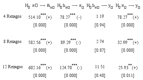 Una vez identificados los modelos óptimos para la medición de los valores promedio de la inflación y el producto, así como sus correspondientes incertidumbres, se procede con el desarrollo de la segunda etapa. En esta se estiman las pruebas de causalidad de Granger con el enfoque de Toda-Yamamoto para poder comprobar las relaciones de retroalimentación para las teorías planteadas, así como los signos con que operan. La tabla 4 muestra las hipótesis de causalidad entre las variables analizadas, se desarrolló una prueba de Wald modificada de exogeneidad en bloque que sigue una distribución estadística 𝜒2 con 4, 8 y 12 rezagos.