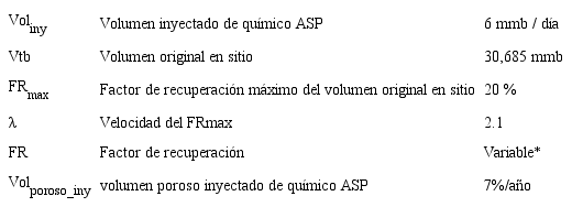Donde VRA depende del volumen original en sitio (Vtb) y que corresponde a las reservas probadas5. FR depende del factor de recuperación máximo (FRmax ), de la velocidad del FRmax (λ), y del volumen poroso inyectado de químico ASP por año6 (Volporoso_iny ). A su vez, Volporoso_iny depende tanto del volumen inyectado de químico ASP (Voli ny ) como de Vtb y 365 corresponde a los días del año calendario. Los valores técnicos requeridos para el cálculo del VRA son los siguientes: