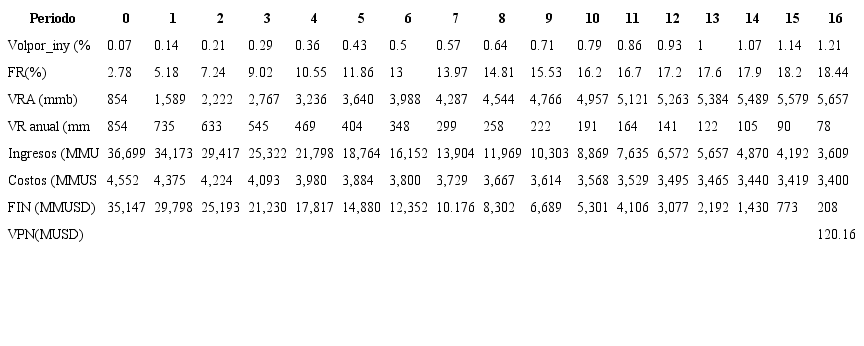 Es importante señalar que la presente investigación llevó a cabo una valoración del proyecto con un mayor nivel de detalle comparado con investigaciones previas (Galli et al., 1999; Bailey et al., 2004; Armstrong et al., 2004). La estimación del volumen de recuperación acumulado de hidrocarburo implicó determinar previamente variables tales como el coeficiente de volumen poroso inyectado (Volporoso_iny) y el factor de recuperación máximo (FRmax ).