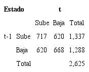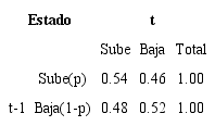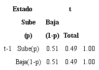 Una vez obtenida la matriz de distribución, se calcula la matriz de probabilidad inicial, tanto del ascenso como del descenso en rendimientos. Dichas probabilidades se calculan por cada fila.