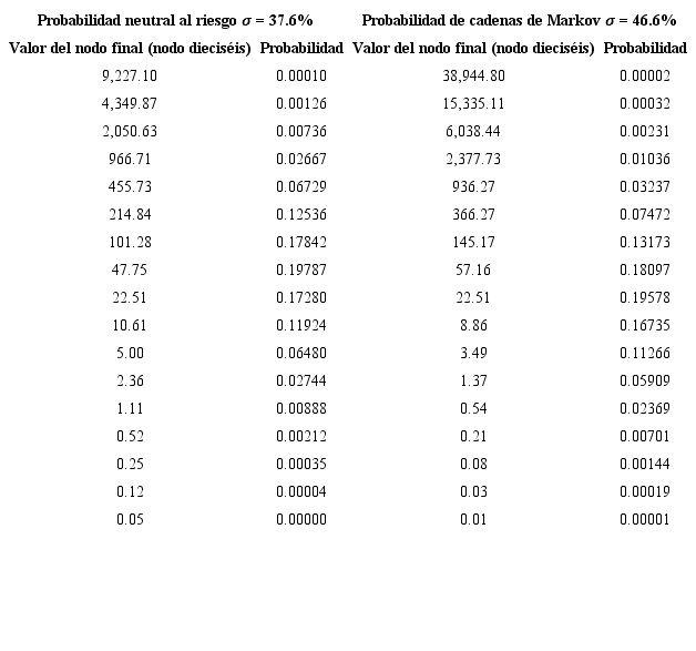 Los resultados indican que la probabilidad de incrementar y disminuir es p = 51% y 1-p = 49%, respectivamente. En este caso, la probabilidad de subir (p) resultó menor a la obtenida mediante la volatilidad histórica estimada. Con la probabilidad de p y con base en las ecuaciones (1) y (2)se determinaron los valores para los coeficientes u = 1.59, d = 0.63, y volatilidad 𝜎 = 46.6%. Es importante notar que, mientras que en el método binomial se parte del valor de la volatilidad, para posteriormente calcular los valores de los coeficientes u y d, y la probabilidad neutral al riesgo (p); en el método de cadenas de Markov se parte del valor de la probabilidad de transición (p) para calcular los valores de los coeficientes u y d, y la volatilidad mediante el método binomial.