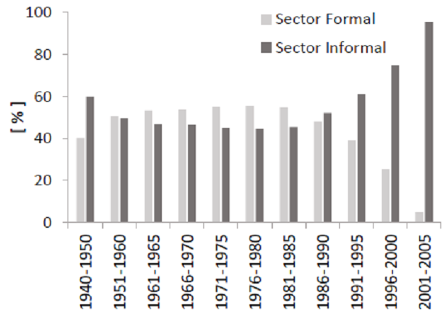 En el caso de los trabajadores en el sector informal se observa que las personas perciben un ingreso superior al ingreso de la primera cohorte, excepto para las personas nacidas a partir de 1996. De hecho, las últimas dos cohortes (1996-2000 y 2001-2005) son los que trabajan en promedio menos horas a la semana (37.1 y 30.7 horas a la semana) y el ingreso por hora es aproximadamente de 94.01 y 79.84 pesos, respectivamente. Estas dos cohortes son los más jóvenes de la muestra, lo que implica que las personas menores de 25 años trabajan menos horas y perciben menos ingresos que en el sector formal.