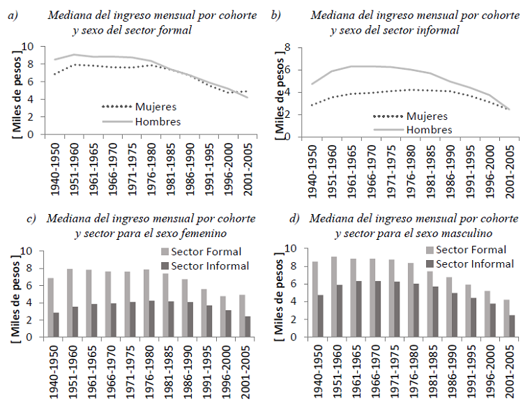 La gráfica 2 ofrece evidencia sobre la mediana del ingreso real mensual por género y por sector de empleo formal e informal para cada cohorte. Esta gráfica confirma que para ambos géneros los ingresos percibidos en el sector formal son superiores a los del sector informal (véase gráfica 2c y 2d). Por otro lado, el panel 1a de la gráfica 1 muestra que la mediana de los ingresos de mujeres y hombres converge; es decir, se reduce la brecha de ingresos entre hombres y mujeres. Esto es notorio desde la cohorte de 1976-1980 y se prolonga hasta la cohorte más reciente.