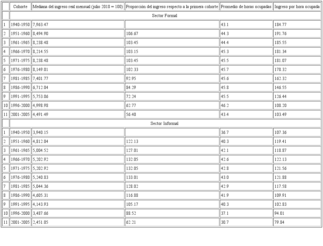 El cuadro 1 presenta información desagregada por sector formal e informal. Específicamente, se muestra la mediana del ingreso real mensual, el número de horas promedio ocupadas a la semana, la relación ingreso por hora ocupada y la proporción del ingreso de la cohorte respecto al ingreso de la primera cohorte. Se observa que el grupo de personas que labora en el sector formal trabaja en promedio más horas que las personas en el sector informal; asimismo, su ingreso es mayor. Esto se ve reflejado en el ingreso por hora ocupada.