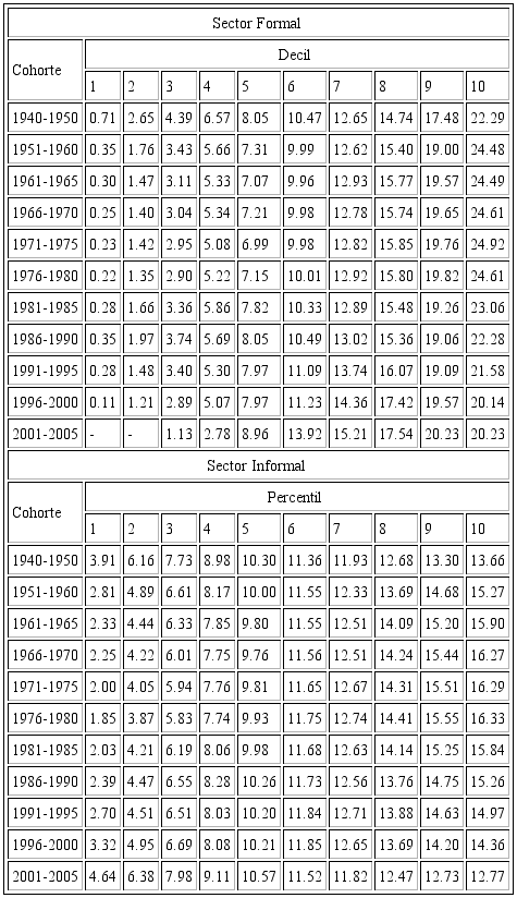 Acabamos de revisar la información de los ingresos por género, situación laboral y nivel educativo. Ahora para examinar de manera más desagregada la movilidad potencial por ingresos, analizamos el ingreso por deciles de las cohortes en cuestión. El cuadro 2 muestra el porcentaje de población por decil de ingreso para cada cohorte, según el sector en el que están empleados. Se nota que cerca de 40% de la población de todas las cohortes que trabaja en el sector formal, se encuentra en los últimos deciles de ingresos (9 y 10), mientras que menos de 1% de la población que se emplea en el sector formal pertenecen al primer decil del ingreso. Cuando analizamos la información para la población que labora en el sector informal, notamos que cerca de 30% de los individuos se encuentra en los últimos dos deciles del ingreso (9 y 10). No obstante, el porcentaje de la población que pertenece a los deciles 1 y 2 es más alto en comparación con el grupo de trabajadores formales.