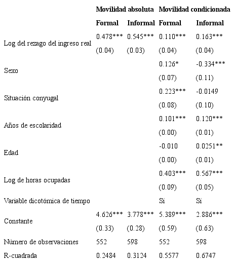 En el modelo condicionado se toman en cuenta otras variables sociodemográficas como variables explicativas. Las columnas 3 y 4 presentan la estimación de la movilidad condicionada, donde el ingreso real es explicado por el género de las personas, la situación conyugal, la edad, el número de años de escolaridad y el número de horas ocupadas. Observamos que el ingreso en un período previo explica de manera estadísticamente significativa el ingreso actual (0.11 y 0.16). Esta persistencia habla de una baja movilidad de ingresos, pero más pequeña con relación a la movilidad no condicionada. Al controlar por dichas covariables, encontramos que existe una movilidad de ingresos que es aún baja, pero que el sector formal tiene mayores posibilidades de movilidad de ingresos (0.11) en relación con el sector informal de la economía (0.16). Estos resultados son consistentes con la literatura sobre la movilidad social en México, ya que se ha encontrado que existe una movilidad social baja (absoluta).
