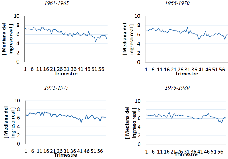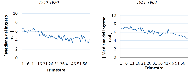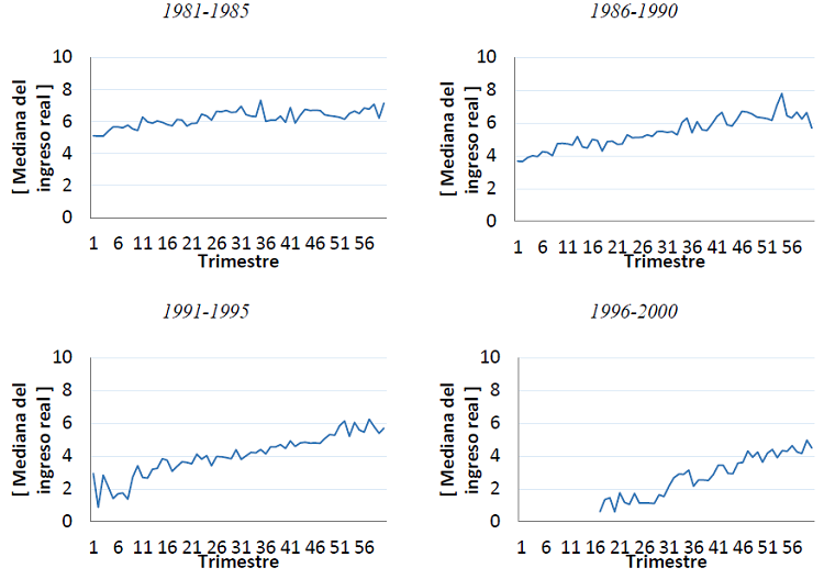 En la gráfica 4 se muestra la tendencia de los ingresos por cohortes. Encontramos que en las primeras tres cohortes (1940-1950, 1951-1960 y 1961-1965) se observa una tendencia negativa en la media de ingresos reales mensuales. Por otro lado, la mediana del ingreso real de las siguientes tres cohortes (1966-1970, 1971-1975 y 1976-1980) empieza a estabilizarse; es decir, su pendiente es cercana a cero. A partir de la cohorte de 1981-1985 y hasta la cohorte más reciente, la mediana del ingreso real tiene una pendiente positiva y, por lo tanto, su poder adquisitivo ha aumentado.
