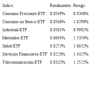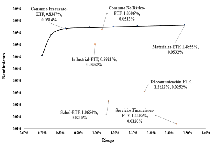 Con base en los datos de los ETFs se construye la frontera eficiente usando ocho portafolios fijando un cierto nivel de riesgo, para así obtener las ponderaciones a invertir en cada sector para maximizar el rendimiento. De las carteras eficientes calculadas se concluye que el sector Materiales y consumo frecuente son aquellos con mejores relaciones riesgo-rendimiento, por lo que, deberían ser los primeros ETFs sectoriales en crearse y ponerse a disposición del público inversionista.