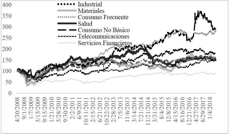 En la gráfica 1 se observa la evolución de los índices sectoriales del año 2008 al año 2018. Se observa una disminución en todos los índices en el año 2008 por la Crisis Financiera Global (CFG), a lo cual sigue una tendencia positiva con algunas caídas a partir del año 2014 que se pueden atribuir a la inestabilidad generada por eventos tales como: variación en tasas de interés de referencia, conflictos políticos internacionales, guerra comercial entre China y EUA, negociaciones del TLCAN, etc. Destaca el comportamiento del índice sectorial Consumo no Básico, el cual reportó un incremento importante, alcanzando su nivel más alto en junio del año 2017 y el sector de Servicios Financieros. que es el que reporta un menor dinamismo y crecimiento, pero también mayor estabilidad durante el periodo de estudio.
