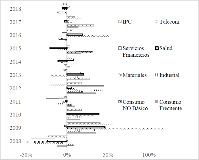 Como se observa en la gráfica 2, en octubre del año 2008 hay una caída generalizada en los índices sectoriales y en el IPC como resultado de la CFG, siendo el sector de Consumo no Básico el único que presentó un rendimiento positivo de 8.6%. En el año 2009 hubo una recuperación importante, sobre todo del sector Materiales, obteniendo un rendimiento del 118% a comparación del IPC que obtuvo un 40.89%, se puede observar que los sectores Materiales, telecomunicaciones y Salud obtuvieron un rendimiento mayor al IPC en dicho año. A partir de ese punto, los indicadores exhiben una tendencia positiva hasta el año 2016 que se presentaron rendimientos negativos, aparentemente por: anuncios sobre modificación en el cobro de comisiones bancarias, depreciaciones cambiarias y anuncios sobre la modificación de tasas de interés internacionales.