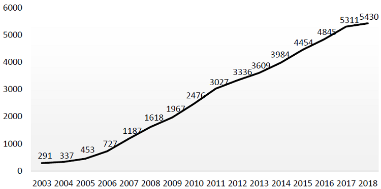 Como se ha mencionado anteriormente, los ETFs han tenido un crecimiento muy importante, sobre todo en los últimos años, la gráfica 3 muestra el crecimiento en el número de instrumentos de esta especie a nivel mundial. En 2006 y 2007 es donde se presentó un mayor crecimiento anual, con referencia al año previo, en el número de ETFs ofertados, alrededor del 60%. Dando como resultado que el número de ETFs se triplicara entre el año 2005 y 2007. En todo el periodo (2003 a 2018), el número de ETFs se multiplicó casi por dieciocho.