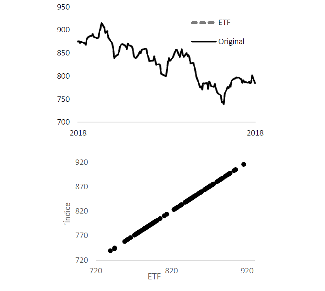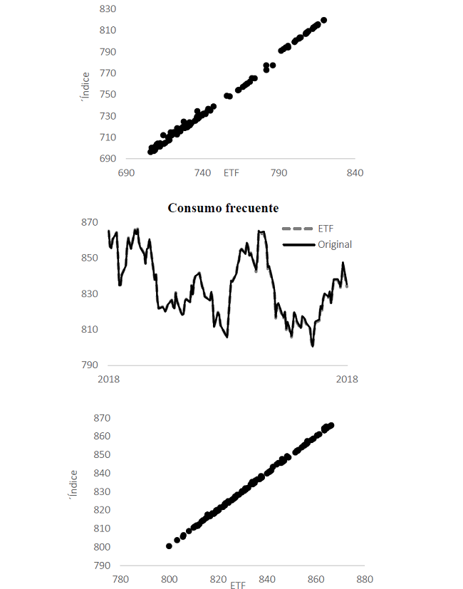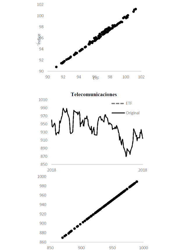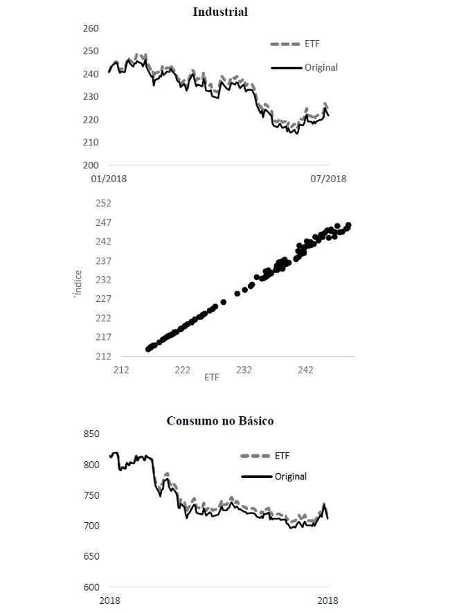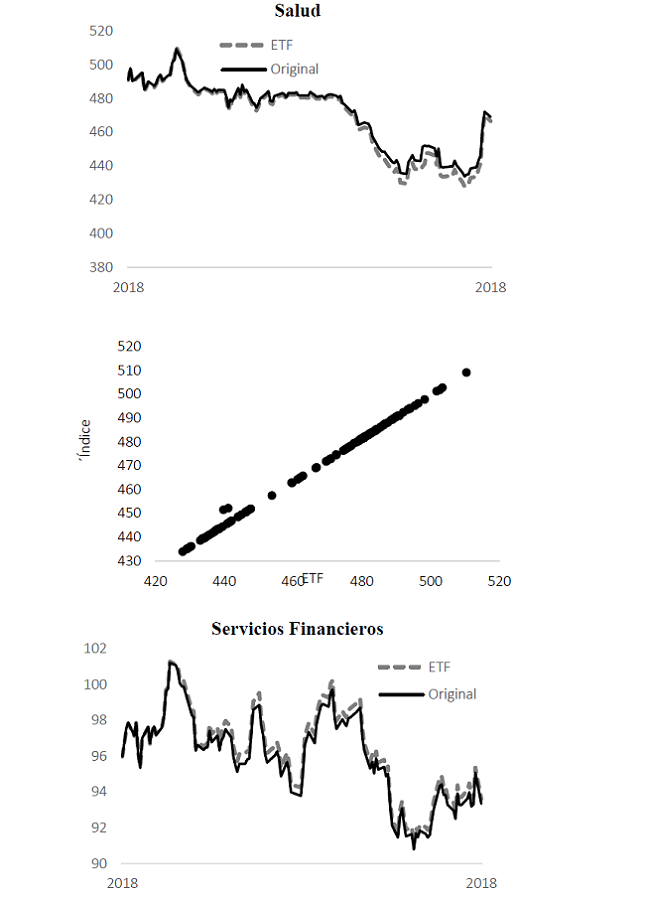 Los resultados de la réplica de los ETFs sectoriales se pueden observar en la gráfica 4 y en el cuadro 1. Las herramientas gráficas dan cuenta de que el algoritmo formulado para el seguimiento del índice es eficiente y aporta resultados satisfactorios, ya que es casi imperceptible la diferencia entre el resultado del ETF y del índice.