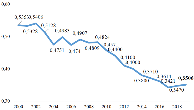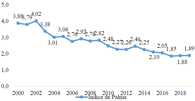 Utilizando a las personas como unidad de análisis, y el ingreso per cápita como variable de ordenamiento y variable a acumular, se obtuvo el índice de Palma para el período 2000-2019, cuyos resultados se muestran a continuación: