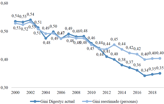 A partir de este gráfico se puede ver que el coeficiente de Gini reestimado, incluso usando la variable de ingreso de hogares, tiene una tendencia parecida al CG estimado con ingresos per cápita, pues tiene una tendencia decreciente menos pronunciada que el CG actual, mostrando claramente una subestimación de la desigualdad por el método actual. De hecho, para 2019, el CG por hogares reestimado es de 0.4043, lo cual es 0.0537 puntos porcentuales mayor, es decir, 15.3 % más que la cifra oficial para ese mismo año.