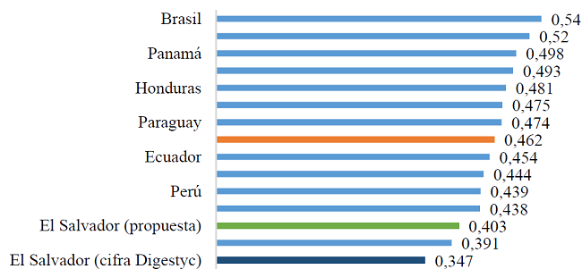 Para observar de mejor manera el impacto que tiene la medición correcta de este indicador, se presenta a continuación una comparación del CG en América Latina, tomando en cuenta el cálculo actual y la propuesta del CG en El Salvador. Es posible ver que la cifra que proporciona Digestyc está muy por debajo de los niveles de América Latina para 2018, y que el CG propuesto posee un nivel más cercano a la generalidad latinoamericana8.