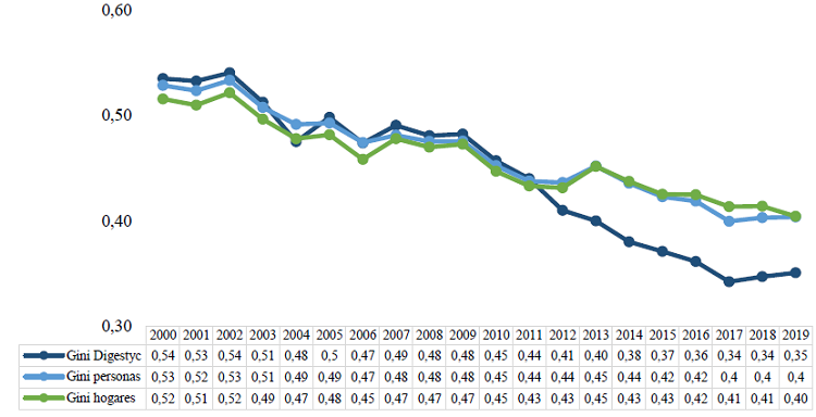 Además de esto, el coeficiente de Gini de El Salvador ha reflejado valores menores a los de países como Uruguay y Argentina, que reportaron al Banco Mundial para 2017 un Gini de 0.3950 y 0.4120, respectivamente. Comparado con el hecho que, según datos de las EHPM para 2019, aproximadamente tres de cada 10 (28.1 %) hogares es pobre multidimensional y aproximadamente una de cada cinco personas vivía en condiciones de pobreza monetaria extrema y relativa (22.8 %), es posible observar que el panorama optimista que refleja el Coeficiente de Gini no es consistente con otra información relevante respecto a las condiciones en las que se encuentra la población salvadoreña.