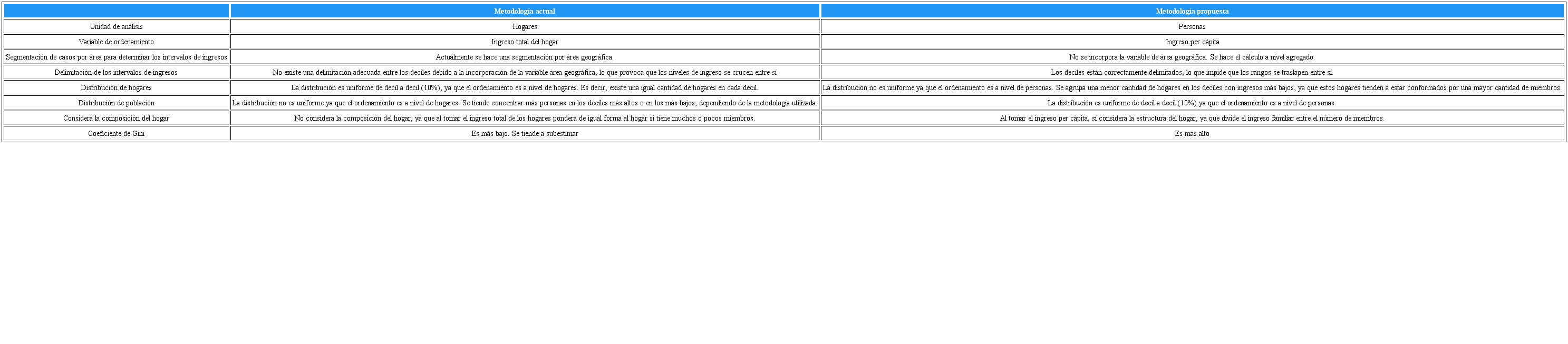 Como se puede ver, se propone una modificación en la unidad de análisis del hogar a las personas, enfocándose en la equidad individual y tomando en cuenta la heterogeneidad en la composición de los hogares en los distintos segmentos de la población, además de mantener la consistencia entre el ordenamiento y la variable a acumular, tal como sugiere la literatura. Además, se propone abandonar la incorporación del área geográfica a la hora de hacer la segmentación de los casos. Para ilustrar mejor las diferencias con la metodología actual con la propuesta, se detalla la siguiente tabla.