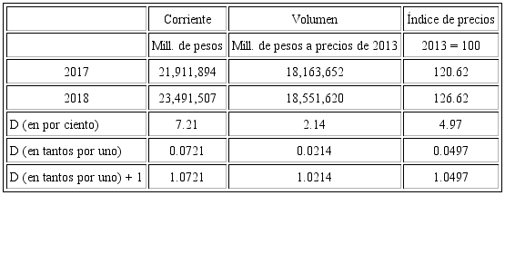 En la ecuación (1) la letra “D” indica que se trata de la tasa de crecimiento en tantos por uno de las siguientes variables: PIB valorado a precios constantes, PIB valorado a precios corrientes, e índice de precios implícito del PIB (DIPIB). Por ejemplo, para el caso de la medición realizada por el INEGI se tienen las siguientes cifras: