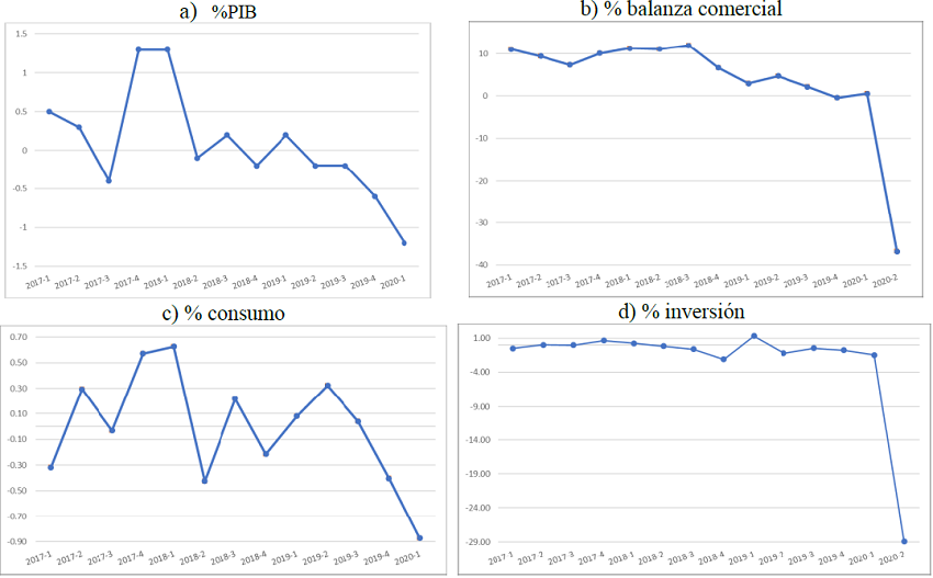 Analizando estos indicadores macroeconómicos de las gráficas en la figura 1, se observa que la balanza comercial, consumo e inversión muestran tendencias a la baja desde el segundo trimestre de 2019, resultando en desaceleración para el cierre de 2019, visible en el panel (a). Como señala la teoría macroeconómica, si el consumo, la inversión y las exportaciones netas bajan, la demanda agregada disminuye, resultando en la reducción del producto interno bruto (Durlauf y Hester, 2016; Jones, 2009).