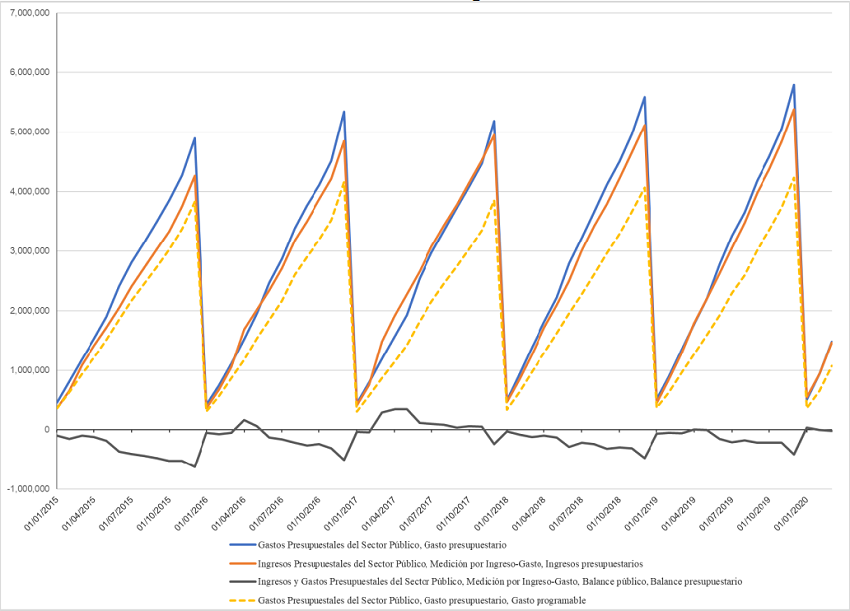 Considerando las finanzas públicas en el mismo periodo de 2015 al 2020, en la figura 2 se observa el gasto público e ingreso presupuestario creciente desde 2017 al cierre de 2019. En el gasto público es notable que la proporción de los gastos programables ha disminuido de los niveles de 78-80% en 2015 a 70% en el inicio de 2020, indicando un aumento en la proporción de los gastos no programables (que incluyen las contribuciones a entidades federativas y municipales, los gastos financieros de la deuda y los adeudos acumulados de años anteriores). Sin embargo, el balance presupuestario (línea gris oscuro en la figura 2), mejoró, pasando de un déficit presupuestario mayor en 2015 (-625,886 mdp) a un déficit menor en el cierre de 2019 (-407,639 mdp). Con esto, en el ejercicio fiscal de 2019 el déficit de balance público tradicional estuvo en un rango aceptable de 1.6% del PIB, mientras que el balance primario presupuestario presentó un superávit de 1.1% del PIB, que fue mejor de lo esperado de 1% (SHCP, 2020b; Domínguez, Clavellina y Morales, 2020).