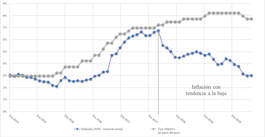 A la par de la evaluación favorable en general por parte del FMI, la política monetaria mexicana presenta una situación interesante. La tasa objetivo empezó a subir desde finales de 2015, al pasar de una inflación inferior a 3%, subiendo paulatinamente hasta 8% para noviembre de 2018 (Figura 3). Según la regla de política monetaria, la tasa objetivo puede frenar la inflación creciente, sin embargo, también puede frenar la producción e inversión a corto plazo, puesto que el costo de préstamo sube (Bordo, 2016; Ireland, 2016; Jones, 2009). En la Figura 3 se observa que, previendo la inflación, la tasa objetivo fue subiendo a partir del último trimestre de 2015 y se mantuvo arriba de 7% cuando la inflación empezó a disminuir desde inicios de 2018 llegando a 3% para el cierre de 2019.