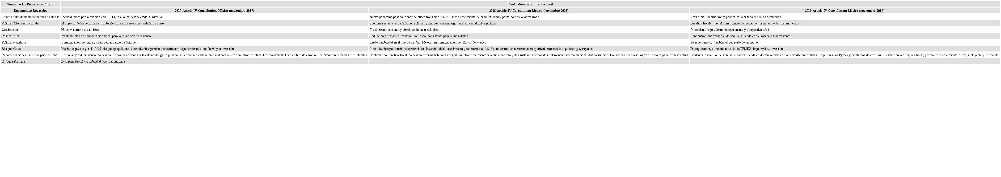 Para este análisis sobre la evolución de la economía mexicana se revisaron primero los reportes del FMI desde 2017 al 2019 (tabla 1) que se publican entre octubre y noviembre. Los elementos clave de los tres reportes permiten ver justamente la evolución de los temas más inminentes según el FMI.