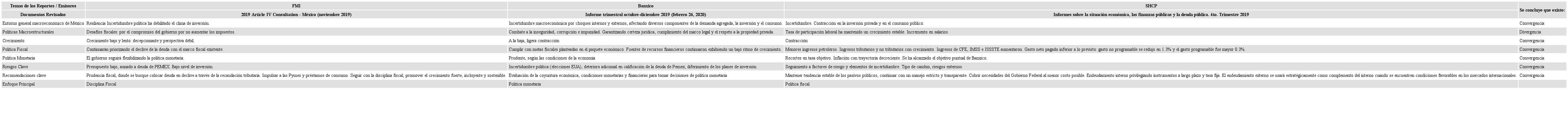 Respecto a los puntos de divergencia, si bien las tres instituciones reconocen desafíos y que se requieren cambios en las políticas macroestructurales, el FMI hace hincapié en reformas encaminadas a obtener mayores ingresos, disminución de la deuda, así como un estancamiento general en la agenda de reformas estructurales. Por su parte Banxico y la SHCP enfatizan los avances que se han tenido durante 2019 en el combate a la corrupción, el cumplimiento del marco legal, respeto a la propiedad privada, el crecimiento en la tasa de participación laboral y el incremento a los salarios. Por tal razón se considera como una diferencia dado el enfoque que tiene cada organismo.