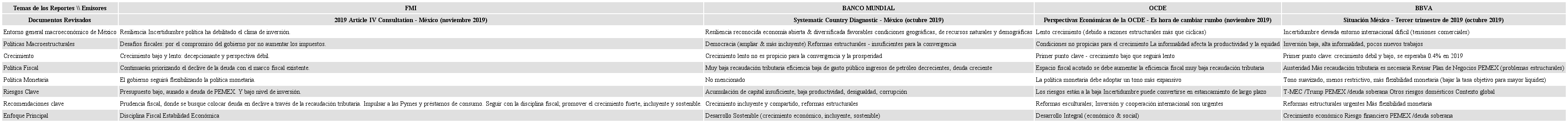 Si bien se han destacado diferencias en los reportes analizados, estas son propias de la naturaleza y misión de cada institución, así como el énfasis que hace cada una de ellas en sus temas de interés. Los puntos de convergencia superan las diferencias y es posible concluir que todos los documentos institucionales reportaron señales sobre la debilidad económica mexicana.