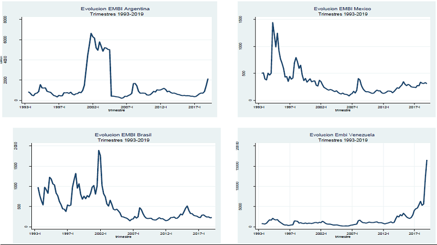 Para poder estudiar la gran variabilidad del indicador riesgo país, este trabajo empírico tiene como objetivo analizar la evolución del indicador en ocho economías latinoamericanas durante el periodo 1993 a 2019 y poder identificar si las causas de las variaciones abruptas del riesgo país se deben a factores propios de las economías bajo análisis o a factores externos a las mismas. Las economías elegidas son: Argentina, Brasil, Chile, Colombia, Ecuador, México, Perú y Venezuela. La elección de las mismas se basa en que éstas forman parte del bloque económico en el cual Argentina se encuentra (Mercosur), y pueden ser afectadas por políticas que lleve adelante éste país, como así también Argentina puede sufrir las repercusiones de las políticas que desarrollen el resto de las economías de la región.
